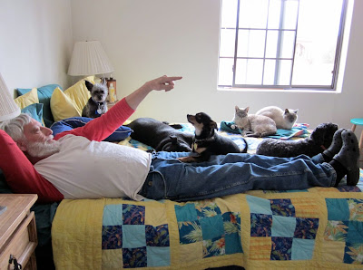 But they were just all so darned cute hanging out together in the sun that I couldn't resist taking this photo. The human is Beez; the dogs are Weetzie, Leny, Little Pete (getting some napping directions), and Emma; and the cats are Gracie and Cody-Ko.
